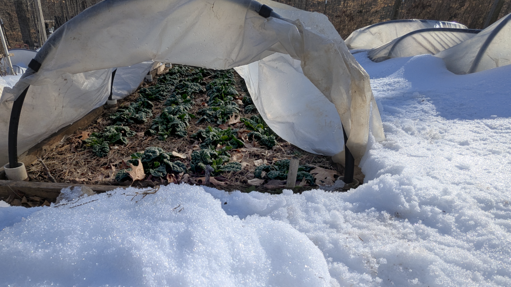 A few weeks ago I waxed poetic about spinach and the crop I carry through the Winter. These amazing beasts have laughed at the cold and the covering of packed sleet. Have a look with the low tunnel covering lifted back.