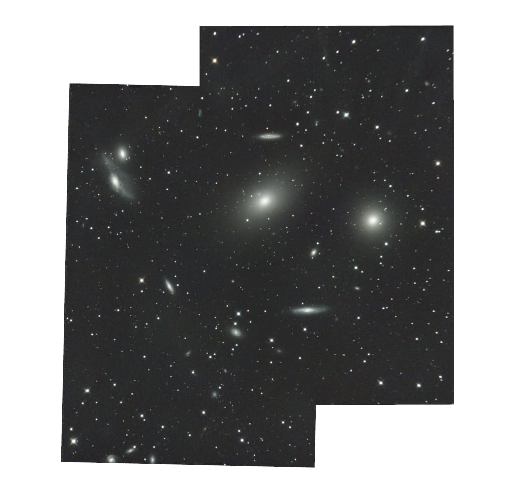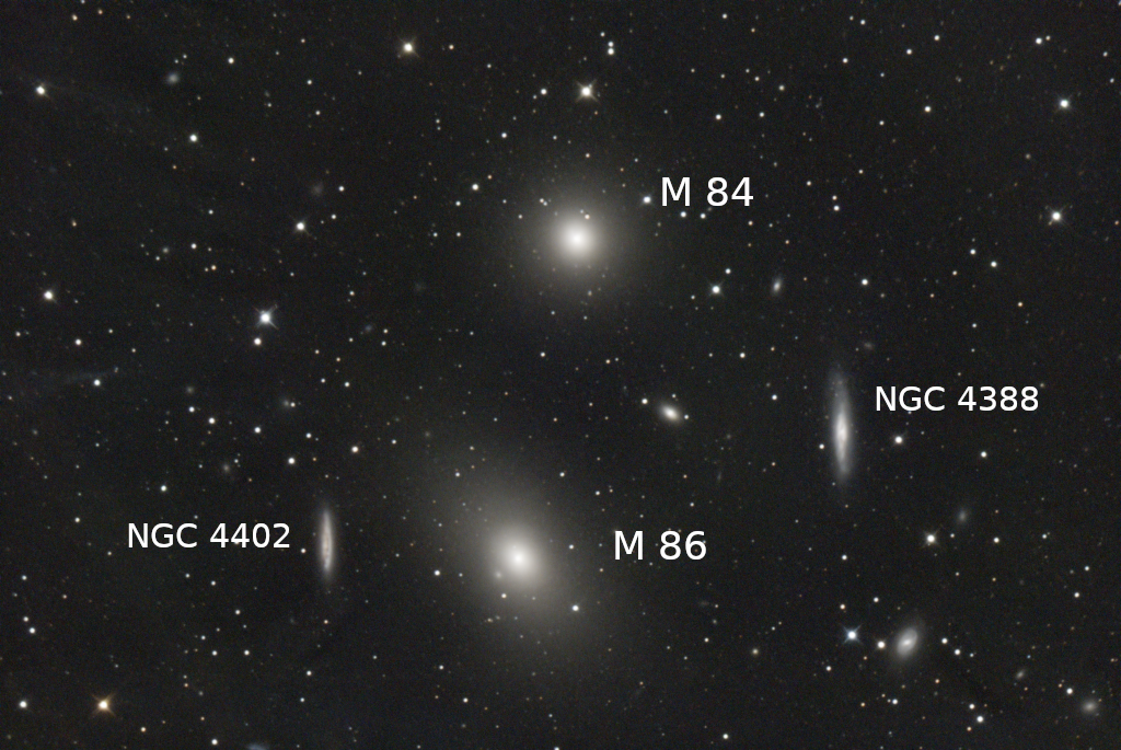 The two prominent "cotton ball" galaxies are M84 (upper) and M86 (lower). They are roughly 110,000 and 135,000 light years in diameter respectively. Both a little bigger than our Milky Way. There are also two smaller edge-on galaxies visible in the image, one on each side, known as NGC 4402 (to the left) and NGC 4388 (to the right). And then numerous additional galaxies, even smaller, dot the field of view.