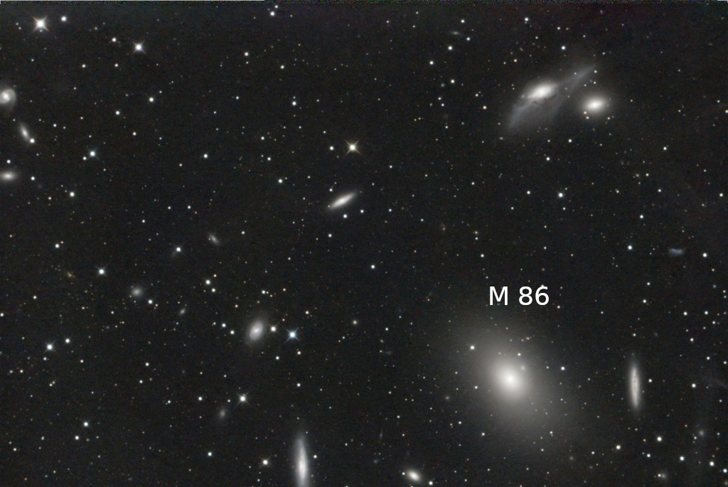 One of those galaxy clusters is known as the Virgo Cluster, and it comes around in early Spring to dazzle those of us tired of cold, damp, cloudy, depressing politics. The Virgo Cluster sports around 1,300 galaxies, all floating in and around the constellation of Virgo. In early March, Virgo is rising in the East around midnight, and its galaxies are suspended well up in the sky, around 50o elevation above the horizon.