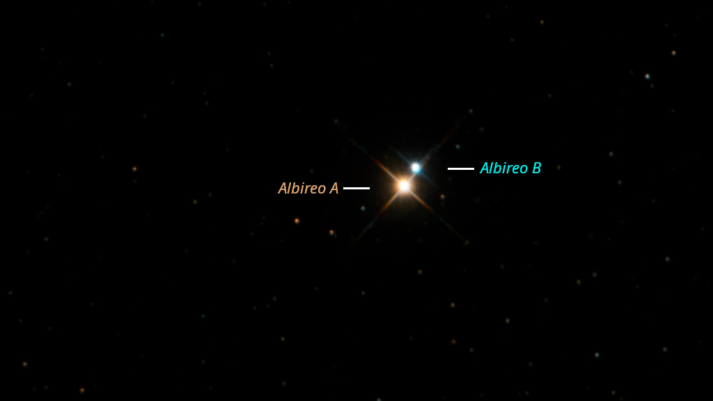 Formally, Albireo A and B could comprise a gravitational bound pair of stars in orbit or, instead, they could simply be an optical double – unrelated stars that look like a double because of our perspective. The distances to both stars were measured by the wonderful, late, Gaia space telescope, and the answer is … we can't tell. The inherent errors in the measurements are too large to answer the question. I like this ambiguity. I'm sure it will be resolved one day soon but in the meantime it puts a skip in my step.