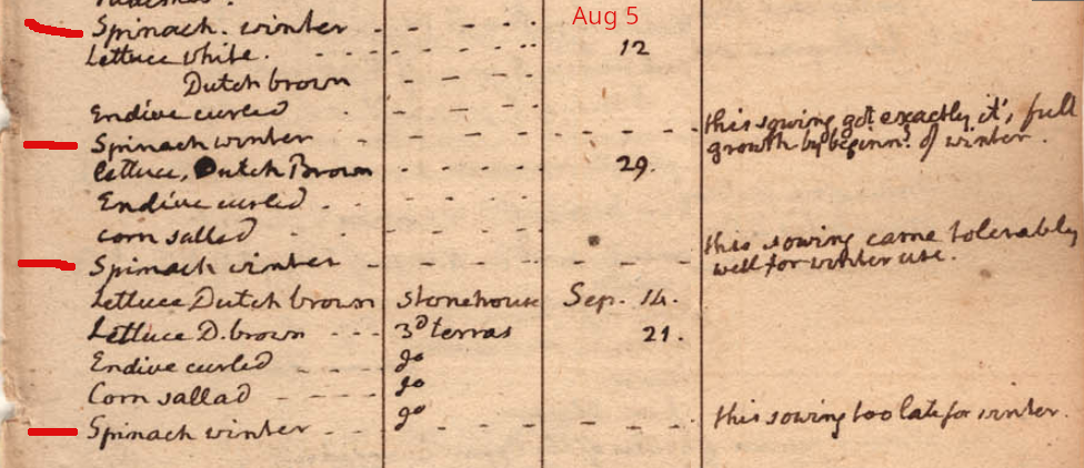 You can see I've highlight four entries for "Spinach winter" in red, which Jefferson sowed on August 5, 12, 29, and September 21. Only three plantings on all of page 43 merit "miscellaneous" comments; all three for the spinach plantings you see in the snippet above. For the "Spinach winter" entry on August 29, Jefferson notes: