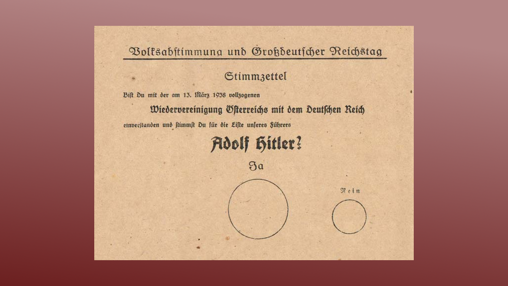 A plebiscite referendum was called on April 10 to ratify the Anschluss. The late historian, Evan B. Bukey, University of Arkansas, noted that most of the polling stations for the referendum were manned by uniformed storm troopers, and that ballots were generally marked in public, not in secret. Roughly 8% of the electorate, about 360,000 voters, were disenfranchised as communists and socialists, or citizens of Roma or Jewish origin. With 4,471,618 votes cast – a 99.71% turnout of eligible voters – the result was 99.73% "Yes" in favor of German Nazi rule. A look at the ballot provides an additional inkling of why.